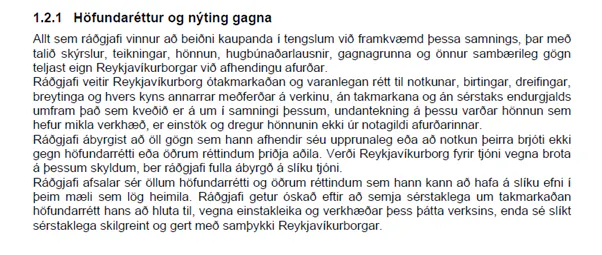 Fundurinn telur að slík ákvæði gangi lengra en eðlilegt getur talist og samræmist illa bæði íslenskum höfundarréttarlögum, meðalhófsreglu stjórnsýslulaga og markmiðum opinberrar stefnu um hönnun og arkitektúr sem Alþingi samþykkti árið 2023. Í þeirri stefnu er sérstaklega lögð áhersla á sanngirni, jafnræði og virðingu fyrir sköpun og réttindum hönnuða.